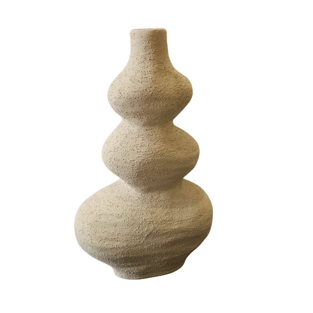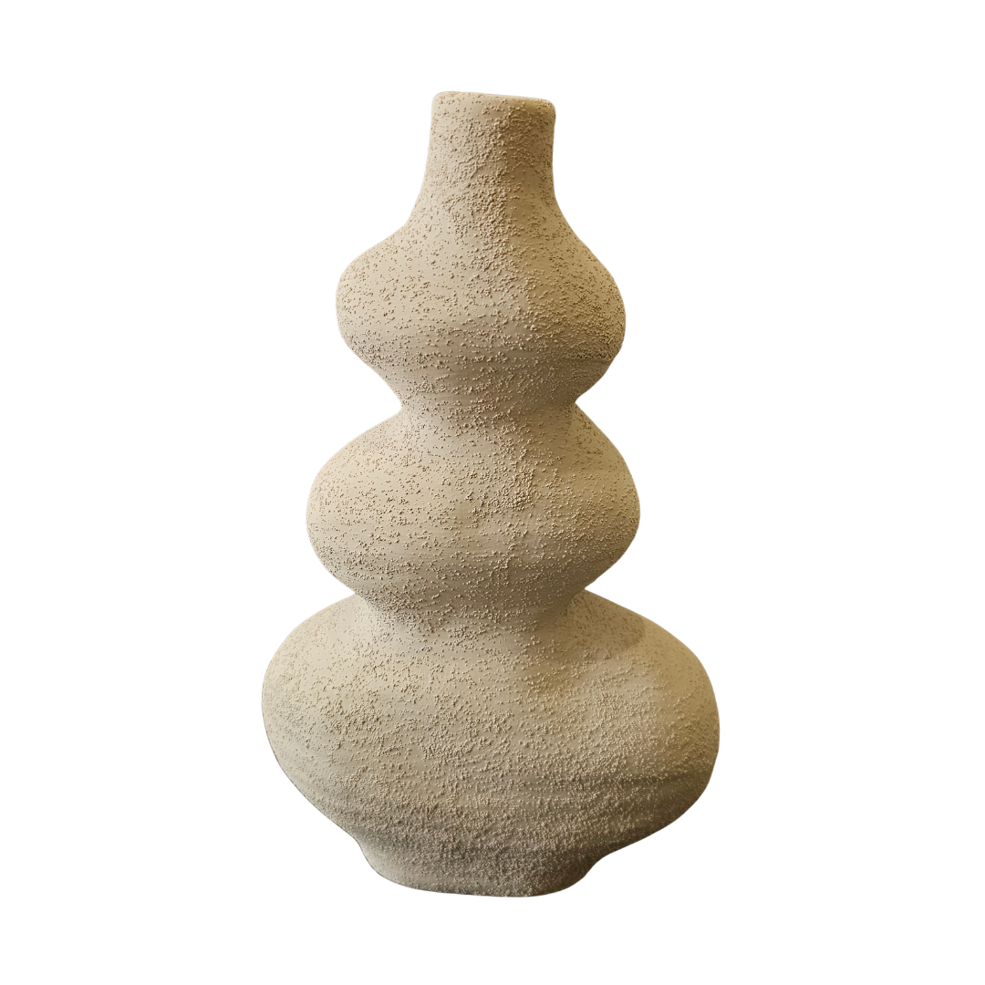 Its rounded, tiered form creates a striking silhouette, while the sand-toned finish and clay-like rough texture give it an artisanal, handcrafted feel.