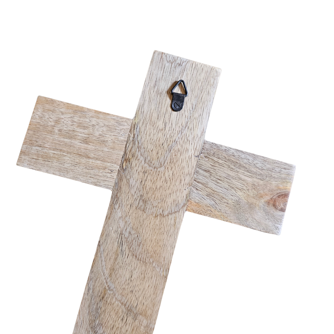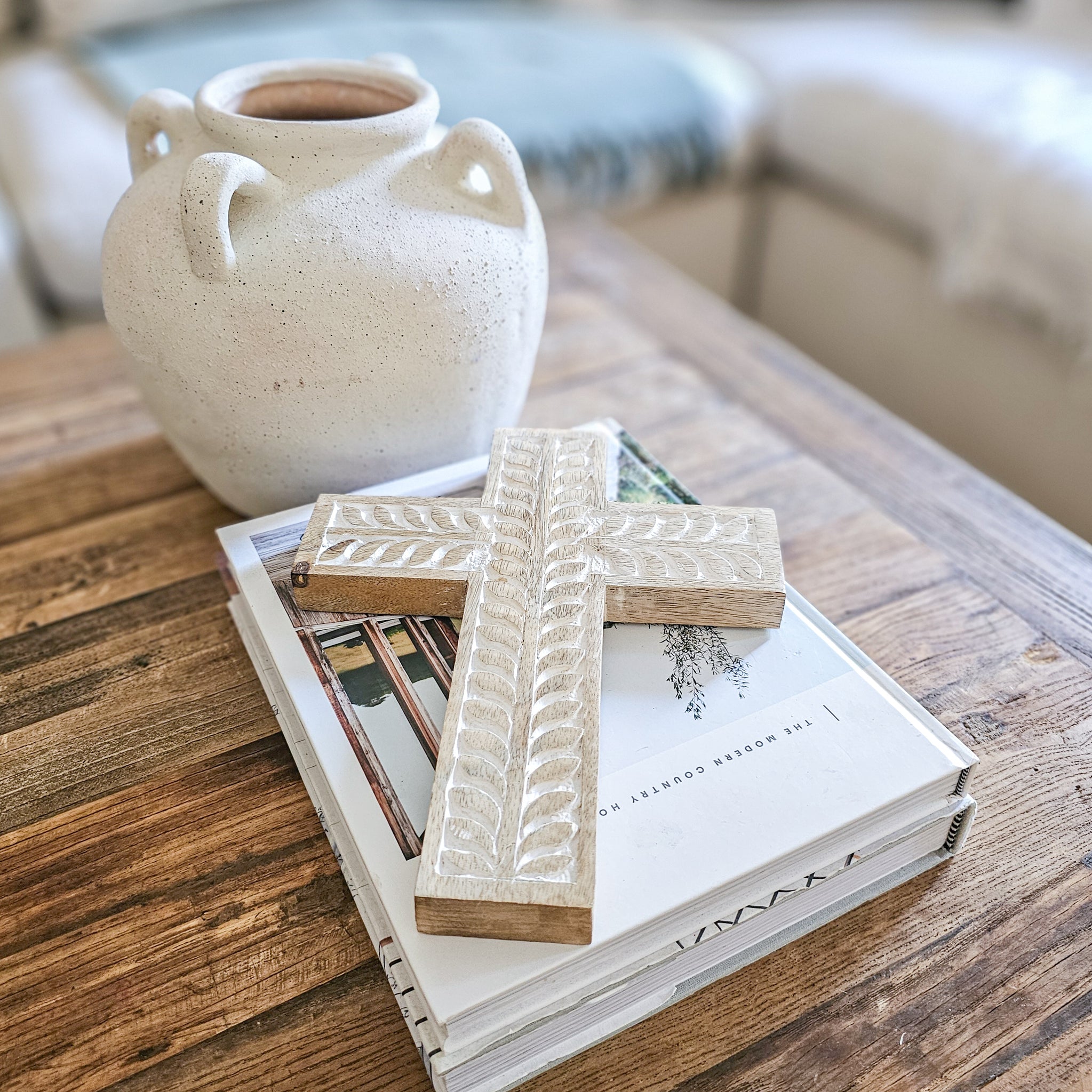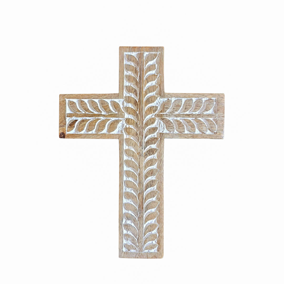 Add a meaningful and beautifully crafted accent to your space with this carved wooden cross. Made from natural wood, the cross features intricate hand-carved detailing highlighted with a soft white wash, creating depth and contrast while allowing the warmth of the wood grain to remain visible. The repeating leaf motif brings an organic, timeless feel that complements both traditional and contemporary interiors.