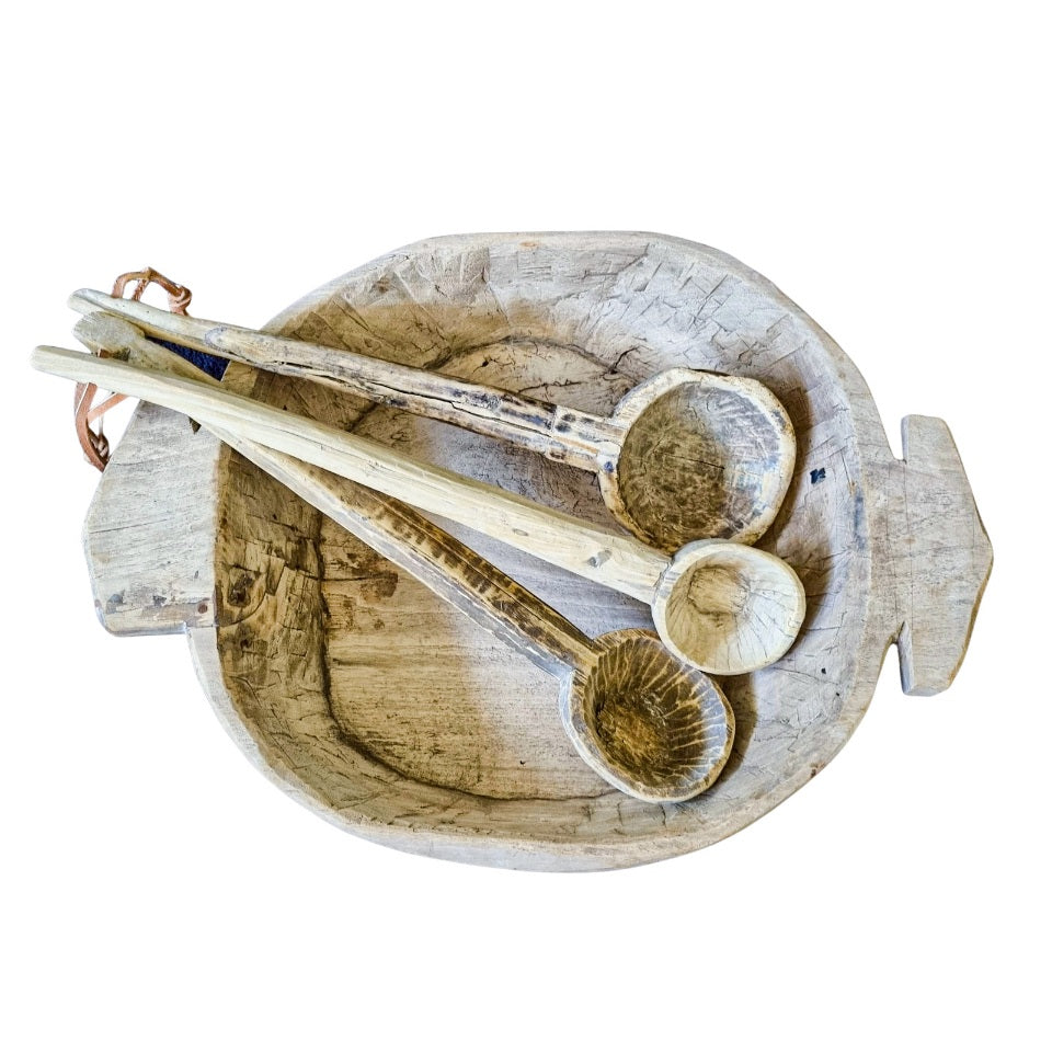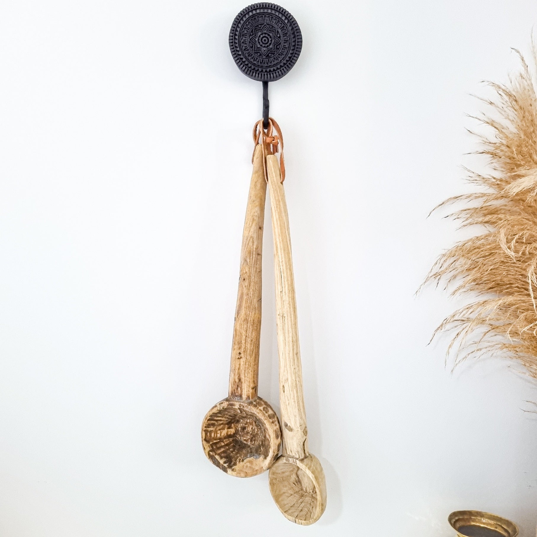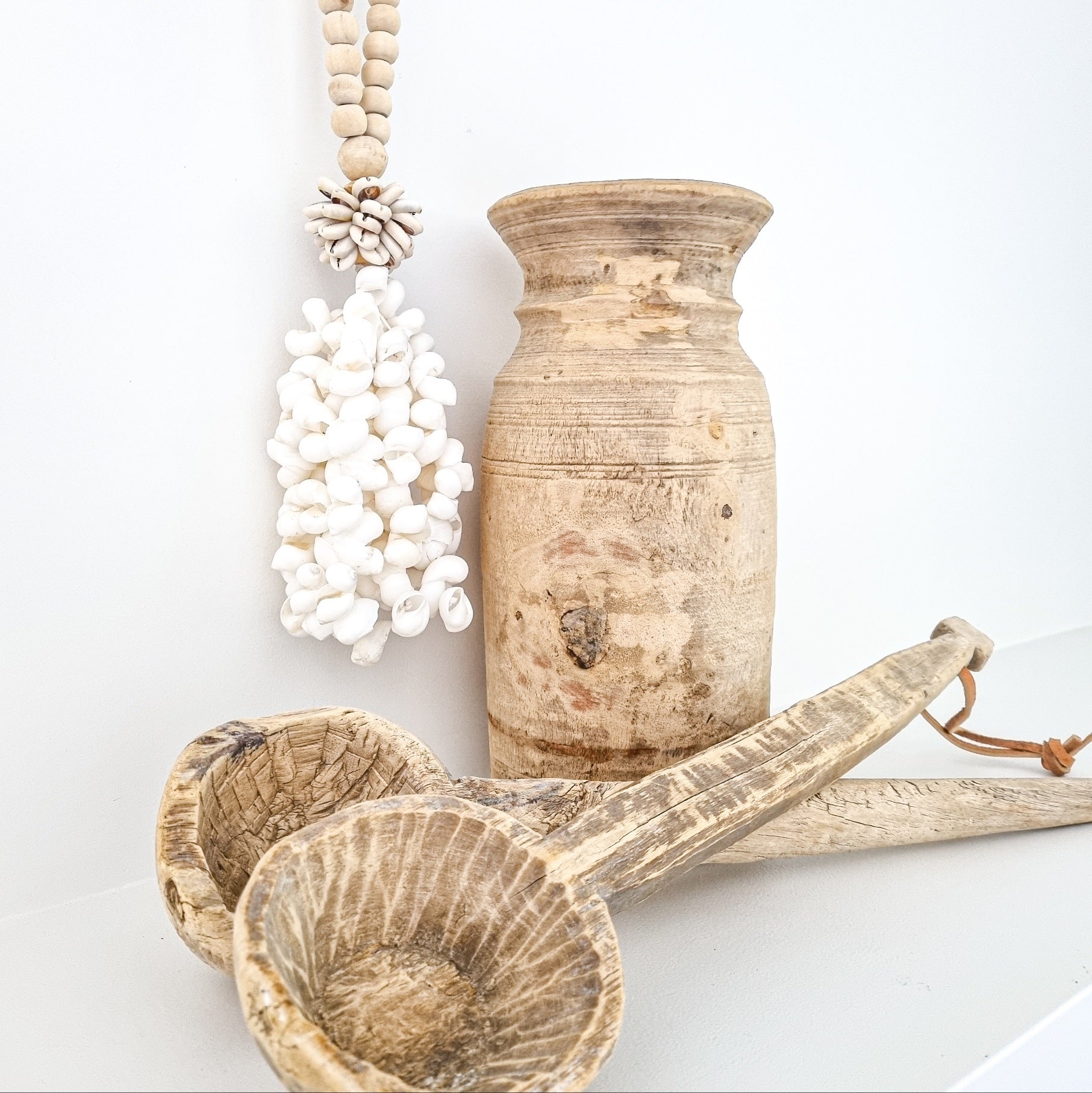 Originally functional utensils, these spoons are now treasured as decorative objects—perfect for styling on shelves, benches, coffee tables, or layered into a kitchen or dining vignette. Their organic shape and warm, weathered patina bring an effortless coastal and bohemian feel to any space.
