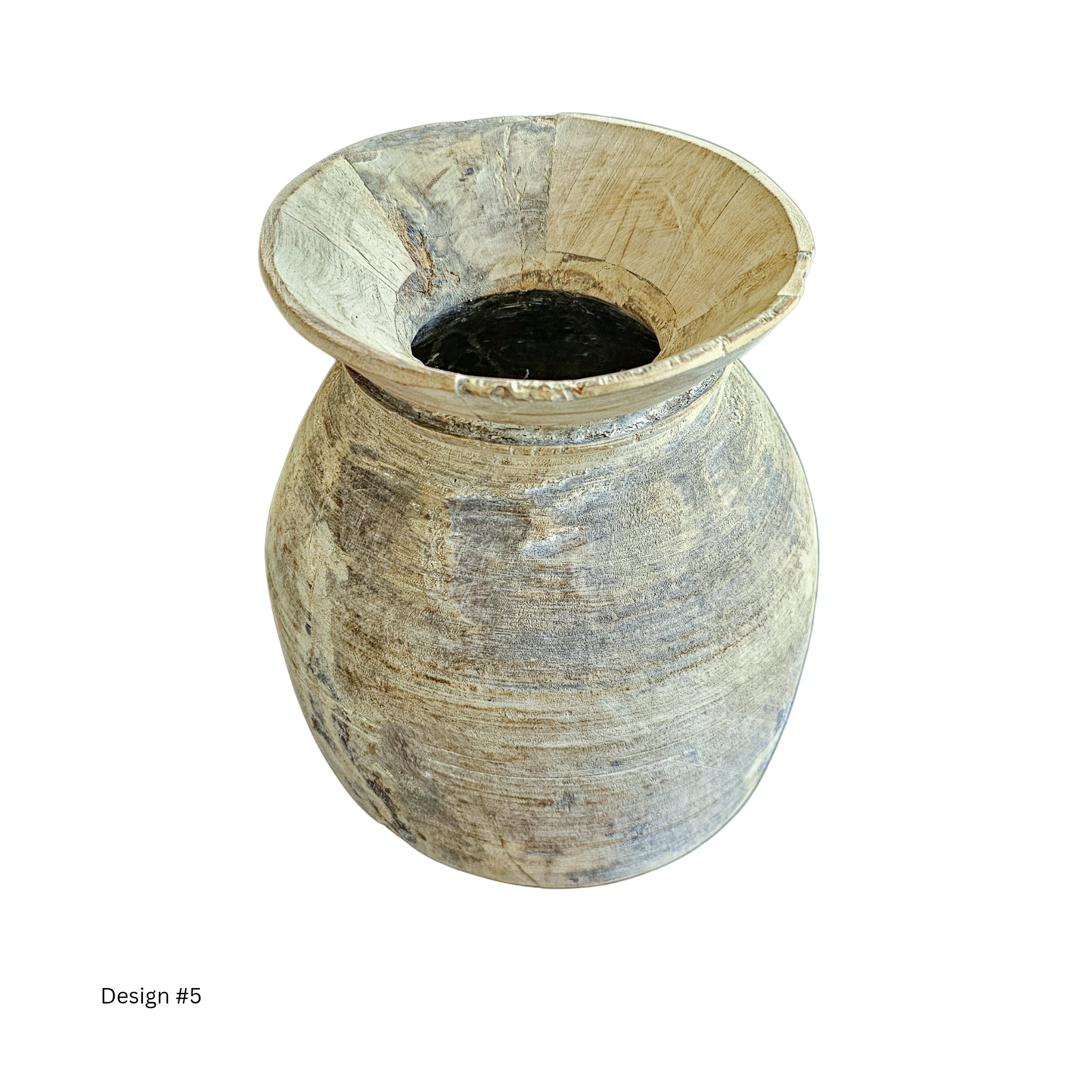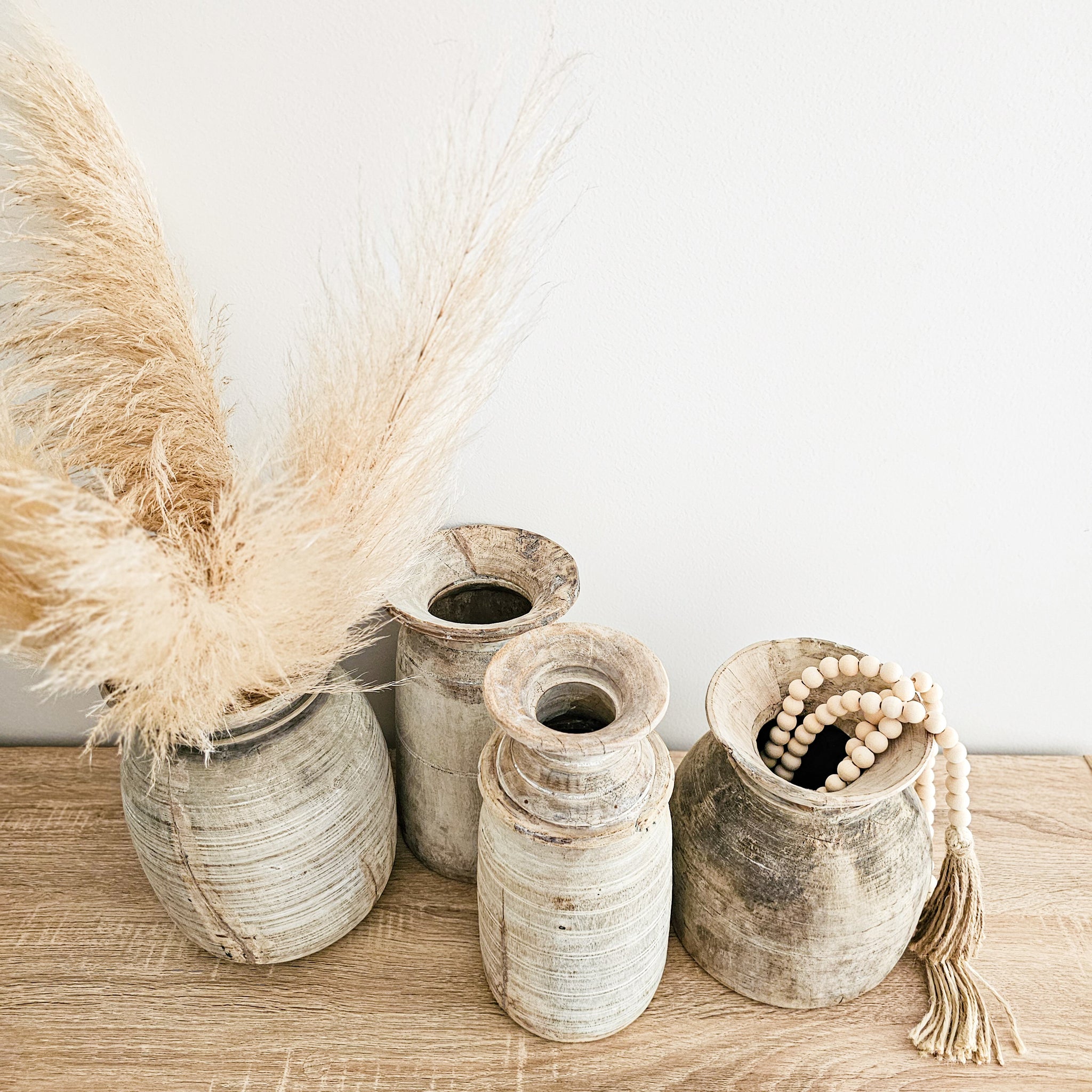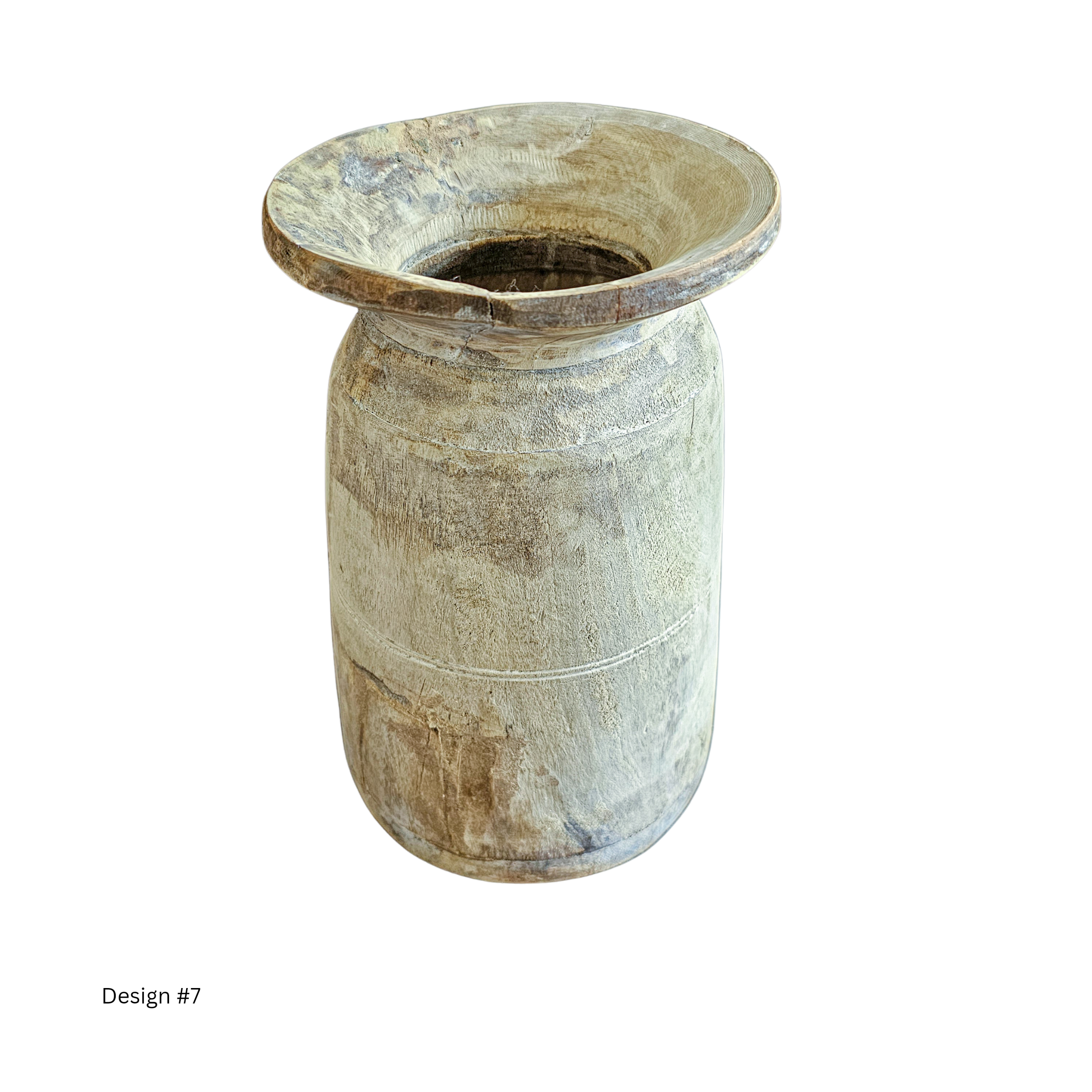 These authentic vintage wooden pots have a beautiful raw earthiness to them that brings a unique aesthetic to your home. Style on a bench top, table, shelf or console and create a centrepiece that offers a rustic vintage charm & character. They look beautiful left empty or style with some beautiful dried florals or palm fronds or fresh leaves.
