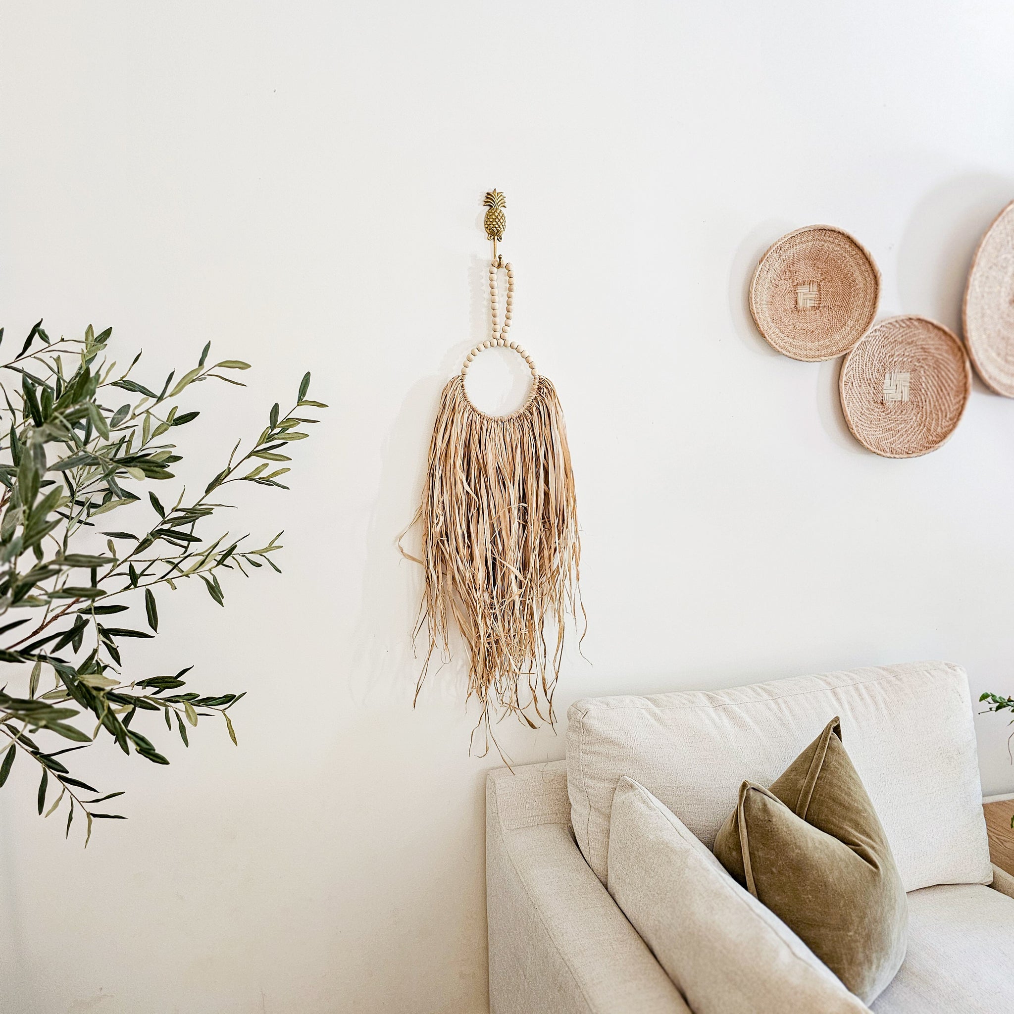 Our Zara Raffia hanging is the ideal piece. It is perfect for those tall narrow spaces ie. Between doors or windows or will work just as beautifully on larger walls styled along side other wall decor or artworks.