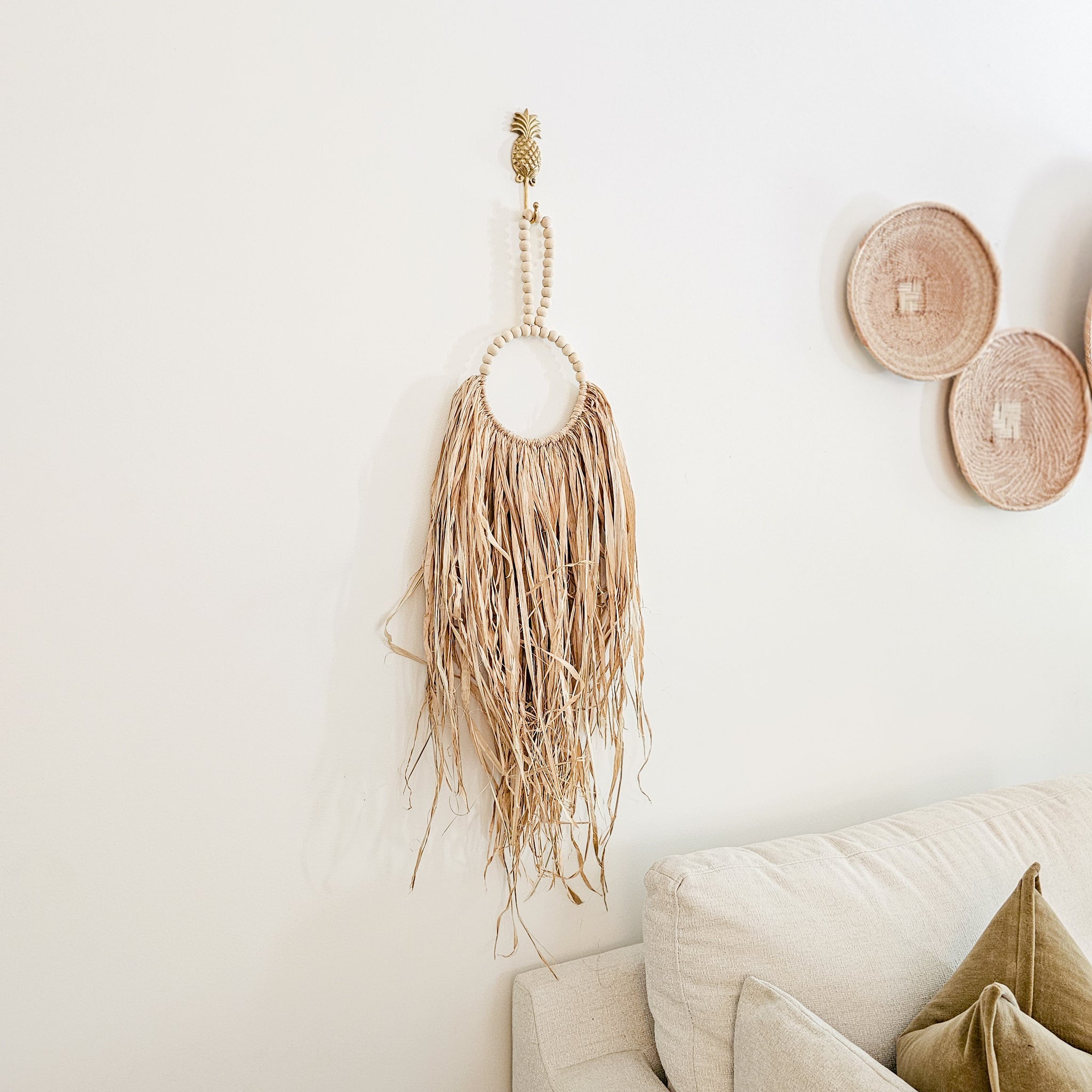 Measures approx. 90cm in length x 25cm width at widest part of Raffia. The beaded loop and hoop is approx. 16cm in length and 17cm diameter hoop.